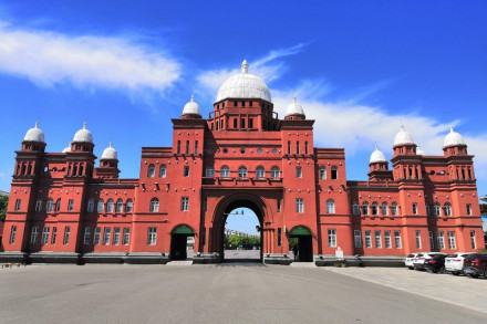 天下第一門是八里河旅游區(qū)的主園區(qū)大門。它綜合了俄、英、美三國的建筑特點,造就了具有八里河藝術(shù)風(fēng)格的建筑,也是景區(qū)的標志性建筑。這個樓堡式大門共有13個白色圓頂,中間一個較為突出,外墻飾有猩紅色的噴砂。