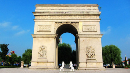 凱旋門是為了紀念拿破侖一世在1805年12月2日的一次戰(zhàn)役中大敗奧俄聯(lián)軍的勝利而建的。在1806年2月12日,根據(jù)拿破侖一世親自批準的計劃,按照著名設(shè)計師戛爾格蘭的設(shè)計圖紙施工,歷時30年,于1836年7月29日竣工。八里河風(fēng)景區(qū)的雄獅凱旋門是按原建筑的1/3縮小。