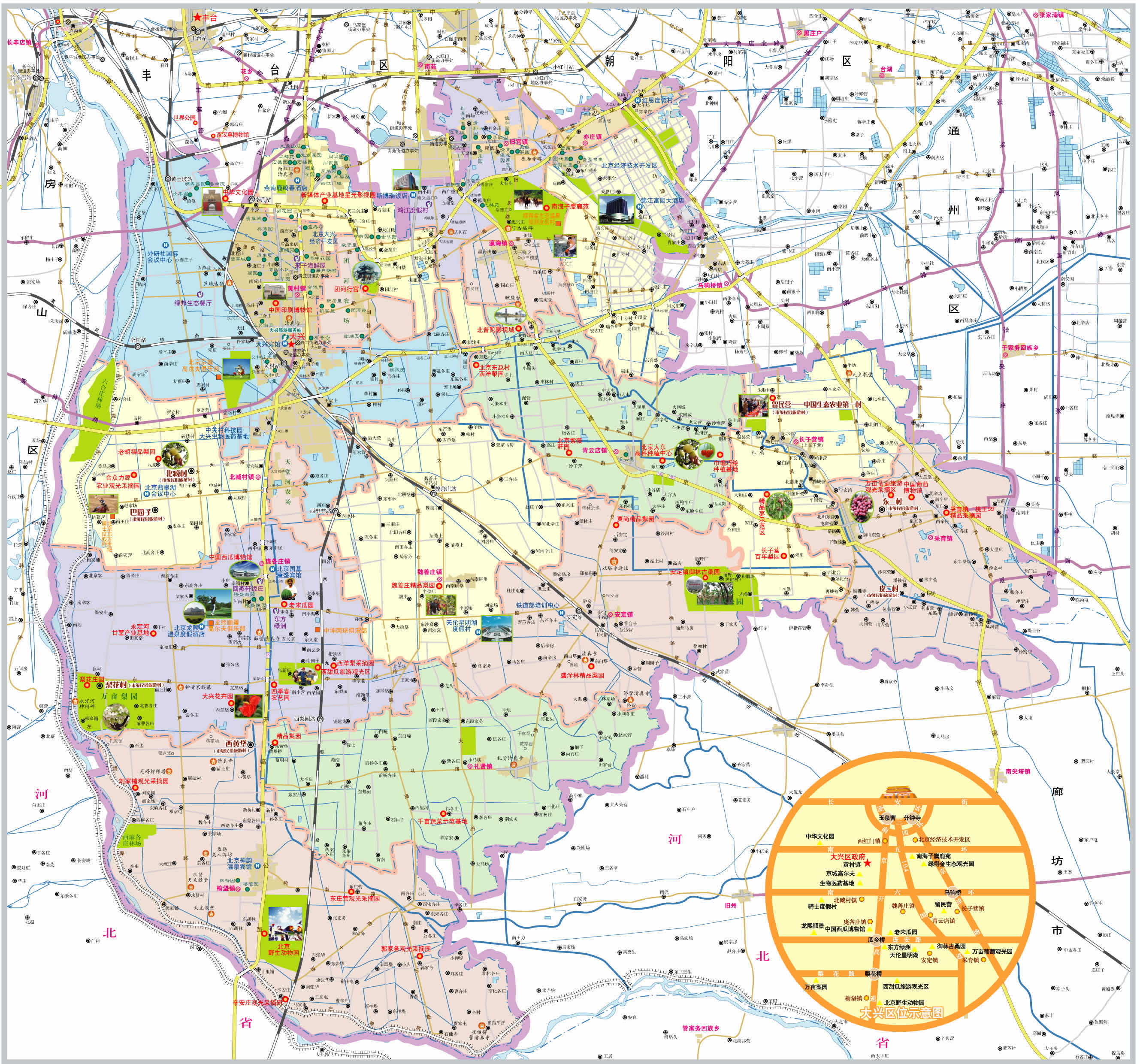 著名景點:南海子公園、中華文化園、半壁店森林公園