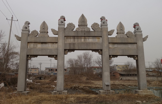 金成明墓石牌坊 金成明墓石牌坊位于青龍湖鎮(zhèn)北劉莊村東,是房山區(qū)文物保護(hù)單位。金成明,正史無考,據(jù)傳為乾隆皇帝的岳父。石牌坊建于清乾隆年間,坐北朝南,為四柱三門式石牌坊,艾葉青石質(zhì),面闊11.55米,明間寬4.20米,次間寬3.70米,四根方形通天柱寬0.6米。柱頂各雕刻有一小石犼,中間雕刻著三顆火焰珠,石坊中間刻有匾額。四周浮雕云紋與瑞獸。牌坊后有碑樓兩座,樓內(nèi)各有螭首龜趺碑記一座,東南側(cè)還有一塊無碑亭的小碑。