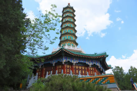 琉璃塔在香山公園宗鏡大昭之廟西部山腰,為該廟組成部分。清乾隆四十五年(1780年)建,高約30米,七級八角密檐式。塔頂安黃色琉璃寶瓶和八條檐脊。塔底由八面張開的傘蓋承托,周飾漢白玉雕欄。最下層為石砌八角形塔基。層層檐端綴有銅鈴。