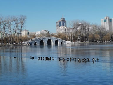引水湖在公園東北部,有一幽靜湖區(qū),原來為林木囤養(yǎng)區(qū),植被繁茂。隨著公園環(huán)路的建設(shè),這個占地9.5公頃,地勢低洼的林區(qū),在1997、1998年被大規(guī);靥罡脑臁T摼皡^(qū)的水系是自東湖而來,至釣魚臺而去。北部地形舒緩開闊,以雪松,銀杏和挺拔的白楊等喬木為主,散布于開闊的草坪,沿公園環(huán)湖路北,配以海棠等春花灌木帶,極具90年代的疏林草地風格。