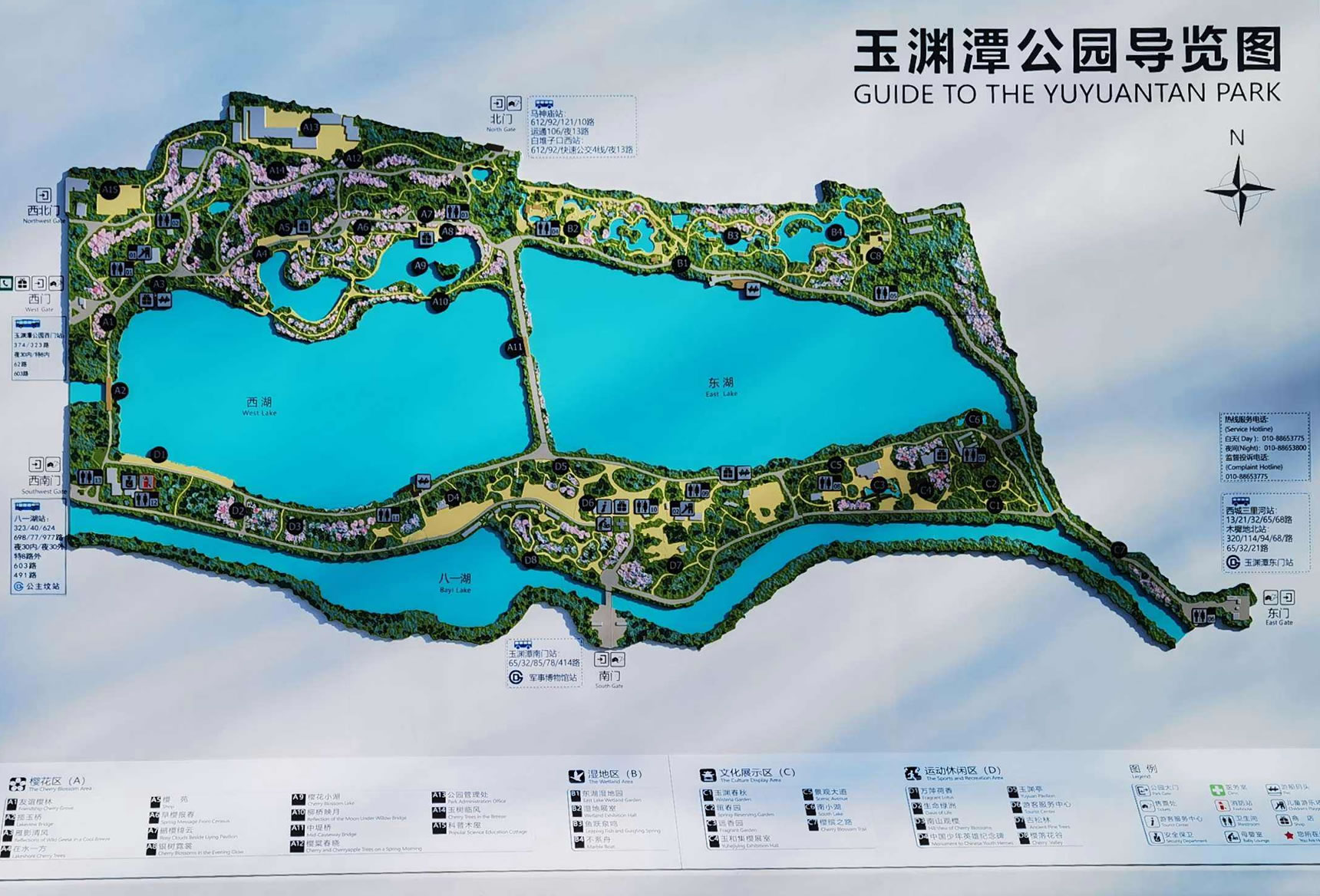 1960年定名玉淵潭公園。截至2015年,東西寬1820米,南北長1106米,規(guī)劃總面積136.69公頃,其中水域面積61公頃,建成綠地面積74.44公頃(含草坪),綠化覆蓋率達到95%以上,園內(nèi)現(xiàn)有各種植物約19.95萬株。公園主要景區(qū)由西部櫻花園、北部引水湖景區(qū)(局部建成)、南部中山島、東面的留春園等組成。公園每年春季都會舉辦“櫻花賞花會”。