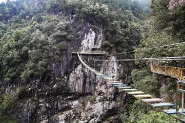 青龍橋位于景區(qū)接待中心服務(wù)區(qū)內(nèi),通過檢票口步行5分鐘可以到達(dá),是景區(qū)戶外項(xiàng)目,由長80米、寬0.8米的鋼絲木板橋和長30米、寬1.5米的玻璃棧道組成,高200米,站在青龍橋可俯視整個峽谷,可體驗(yàn)走鋼絲的感覺,驚險刺激。
