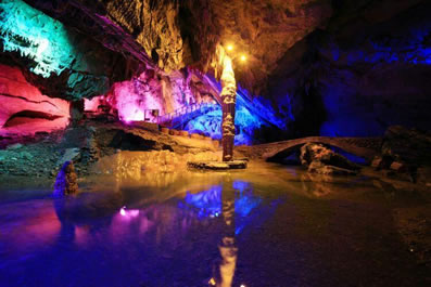青龍洞位于牛角寨下行3.3千米處,溶洞環(huán)線總長1590米,有上下兩個支洞,洞內(nèi)溫度宜人,常年恒溫16攝氏度。青龍洞是石灰?guī)r地區(qū)被地下水幾十萬年長期溶蝕而形成,洞內(nèi)沉積物極其豐富,鐘乳石、石花、石筍、石幔、石旗、邊石壩等分布密集。沿途有漢白玉觀音像、九子龍門、龍池、龍女彩帳、龍王戲水、擎天玉柱、步步生蓮等景點(diǎn)與玻璃棧道、激光燈光融合的特色夢幻溶洞景觀。在溶洞盡頭有一幕兩百多米高的銀白瀑布,名洞天飛瀑,瀑布四壁呈圓錐形,指向高高的穹頂,聲如雷鳴,雄偉壯觀。