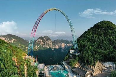 飛拉達是意大利文,是巖壁探險或鐵道式攀登的音譯,指在山體巖壁上建設(shè)由鋼扶手、腳踏、生命鋼纜等構(gòu)成的攀登徑道。龍缸景區(qū)飛拉達位于標識性景點云端廊橋左側(cè),距石筍河垂直高度700余米,攀登徑道全長600余米,主要由彩虹橋、鋼索、長空棧道、十二生肖秋千橋、空中圖騰柱、攀爬梯道組成,其中彩虹橋全長62米,因橋面板上繪制有不同色彩和風(fēng)景而得名。鋼索橋長約41米,由一根走繩、兩根扶繩組成,走繩非常細小,刺激驚險。整個項目的錨固方式為采用化學(xué)錨栓錨固技術(shù)將鋼錨植入巖石1米多深,每一條鋼索的承重達到2噸左右。