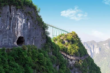云端廊橋建在龍缸海拔1010米的絕壁之巔,懸挑長度26.68米,比美國科羅拉多大峽谷玻璃廊橋長5米多,位居世界第一。廊橋橋面、護欄采用全通透超白玻璃制作,可720度觀景。其造型設(shè)計、透視效果、驚險刺激程度全球領(lǐng)先。廊橋上每年要舉行世界低空跳傘大賽,人們可在驚險刺激的空中飄移中欣賞自然風(fēng)光。