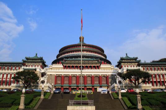 重慶市人民大禮堂,位于重慶市渝中區(qū)人民路173號,于1951年6月破土興建,1954年4月竣工,是一座仿古民族建筑群,是重慶十大文化符號,是中國傳統(tǒng)宮殿建筑風(fēng)格與西方建筑的大跨度結(jié)構(gòu)巧妙結(jié)合的杰作,也是重慶的標志建筑物之一。