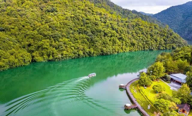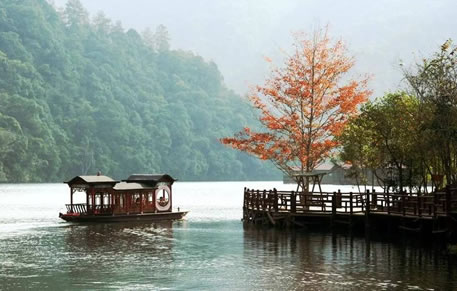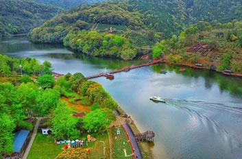 景區(qū)中的水域長達(dá)七公里,清澈的水流,色彩斑斕的山林倒影,構(gòu)成生機(jī)勃勃的山水畫卷,使人有“舟行碧波上,人在畫中游”的親切感受。這里是各種野生動(dòng)植物的聚集地,有各種奇花異草和珍禽走獸。每年年底到次年的初夏,總有一大群鴛鴦飛臨此地,在這水質(zhì)清純、環(huán)境優(yōu)美的地方過冬,為景區(qū)增添了愛的溫馨,傳播愛的信息。