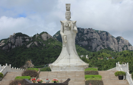 太姥娘娘雕像左邊是烏龍崗,右邊是虎頭崗,前眺東海,幜袓u,背靠摩霄峰。雕像由288塊花崗巖組成,疊高18層,高20.88米(含基座),臺(tái)階的臺(tái)數(shù)、級(jí)數(shù),都暗合道教所推崇的數(shù)字“九”。雕像造型方中有圓,以方為主,吸收了北魏石窟雕像的秀骨清相的特點(diǎn),揉進(jìn)少許盛唐時(shí)代人物面部的豐潤,同時(shí)又從漢俑中吸取單純簡潔之韻味。
