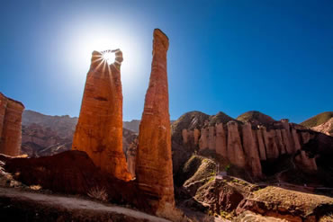 這是冰溝丹霞景區(qū)的又一標(biāo)志性景觀。兩個并排而立的石柱,高約50米,它是由紫紅色砂巖、礫巖、夾砂礫巖構(gòu)成,在流水沖蝕及凍融風(fēng)化剝蝕等外動力作用下,沿著垂直節(jié)理崩塌、解體,使巖墻分割,形成兩個孤立的直徑不同的石柱,均上細(xì)下粗、上圓下方,說明風(fēng)化作用是自上而下進(jìn)行的.石柱下方還基本保留原始節(jié)理切割地層后留下的棱角,形狀像一對逼真的男女生殖器官。左側(cè)的石柱為男柱,頂端如蘑菇;右側(cè)的石柱為女柱。