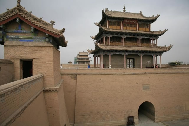 內(nèi)城四角有角樓,也叫“戍樓”,形如碉堡,是守城士兵值勤放哨的地方。南北城墻建有敵樓,是放置兵器的地方。站在這里回望,“光化樓”、“柔遠(yuǎn)樓”及“嘉峪關(guān)樓”三座高大建筑,同在一條中軸線上。這種“過(guò)洞式城門(mén)”及高臺(tái)樓閣建筑形式,是中國(guó)幾千年建筑歷史及建筑形式的延續(xù)發(fā)展。