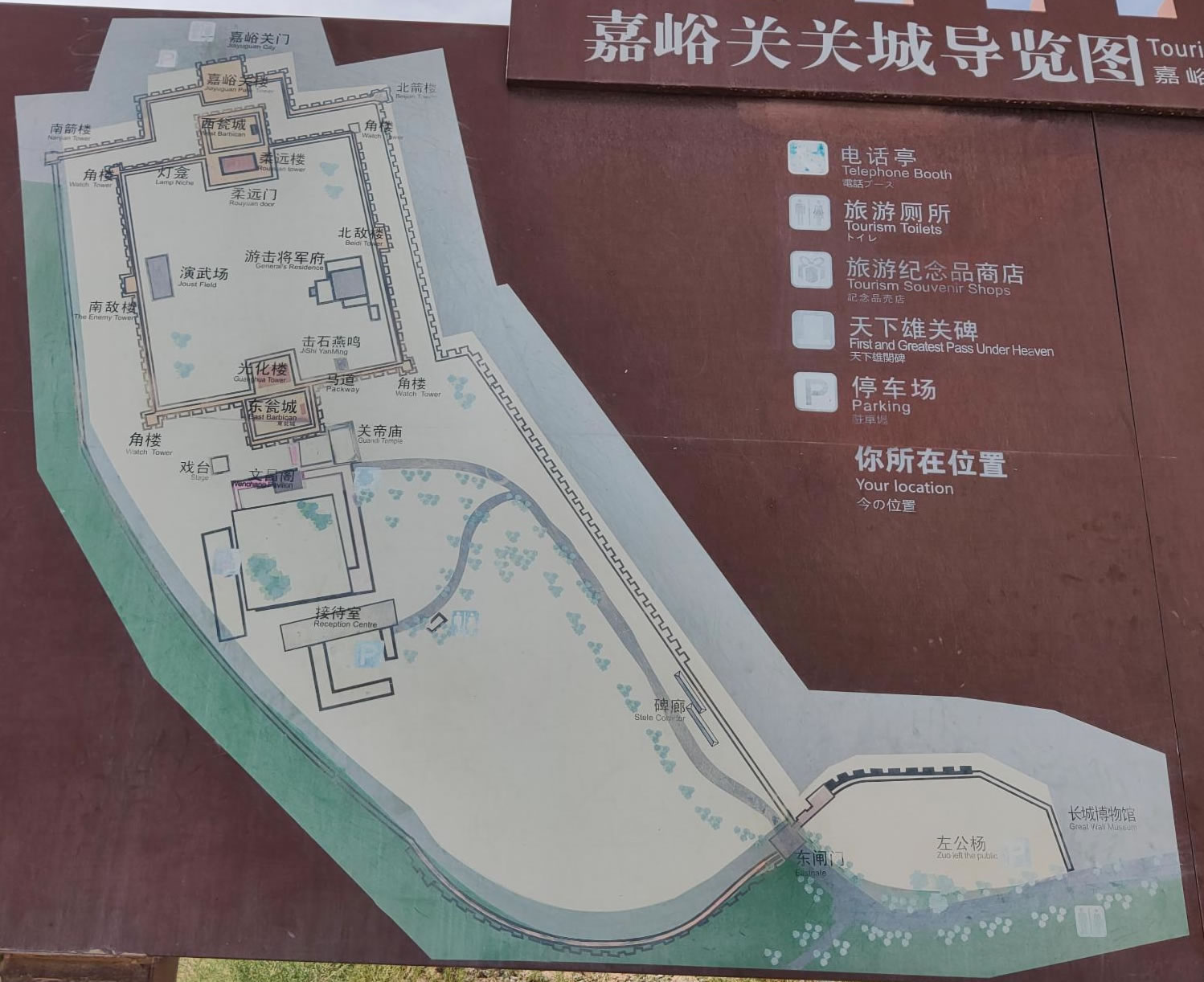 關(guān)城周長(zhǎng)733米。關(guān)城正中有一官井,舊有亭,今已廢。西門(mén)外套筑一道凸形城墻,構(gòu)成一個(gè)羅城,這就是外城。外城比內(nèi)城高2.7米。外城正中大門(mén)額刻“嘉峪關(guān)”三個(gè)大字。門(mén)頂原有城樓,與東西二樓形制相同,三樓東西成一線。民國(guó)十三年(1924年)城樓被毀。西面羅城磚砌,東、南、北有土筑圍墻,連接長(zhǎng)城。城外有城,迭門(mén)重城,成并守之勢(shì)。東甕城外有文昌閣、關(guān)帝廟、戲樓,城內(nèi)靠北有游擊衙門(mén)府一座,都是清代建筑。新中國(guó)成立后,關(guān)城曾多次維修加固,保存完好。