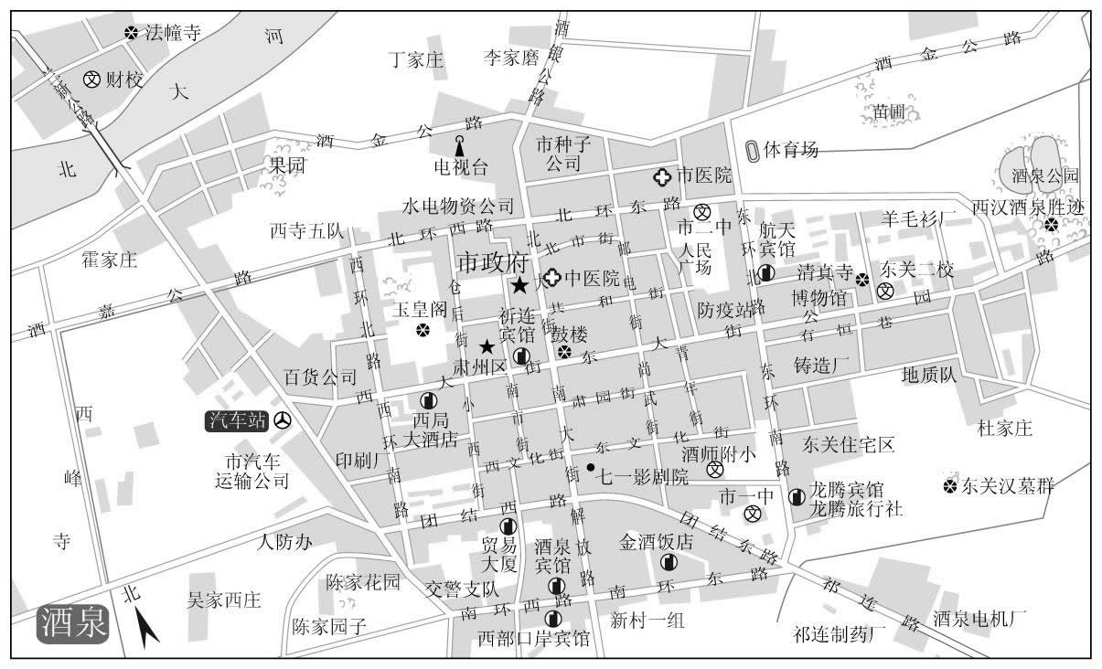 酒泉市內(nèi)主要醫(yī)療衛(wèi)生機(jī)構(gòu):酒泉市人民醫(yī)院、酒泉市疾病預(yù)防控制中心(市衛(wèi)生監(jiān)督所)、酒泉市婦幼保健院、酒泉市中醫(yī)醫(yī)院、酒泉市中心血站