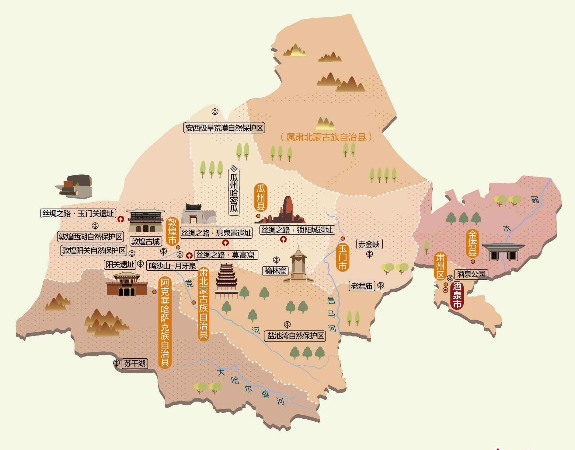 酒泉市為漢代河西四郡之一,絲綢之路的重鎮(zhèn),因“城下有泉”、“其水若酒”而得名。酒泉市是敦煌藝術(shù)的故鄉(xiāng),現(xiàn)代航天的搖籃、新中國(guó)石油和核工業(yè)的發(fā)祥地、“鐵人精神”的誕生地。先后獲影響世界的中國(guó)文化旅游名城、中國(guó)最具國(guó)際影響力旅游目的地等榮譽(yù)稱號(hào)。酒泉市境內(nèi)有敦煌莫高窟、安西鎖陽(yáng)城、酒泉公園、敦煌雅丹國(guó)家地質(zhì)公園等旅游景點(diǎn)。