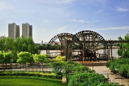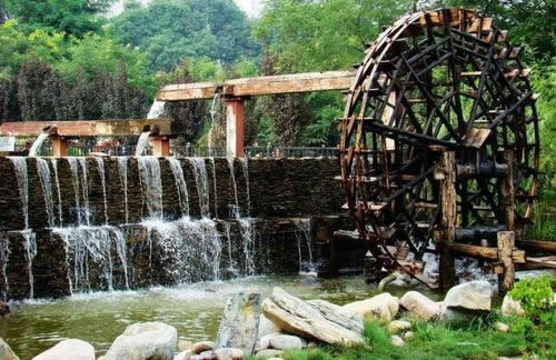 水車歷史悠久,外形奇特,起源于明朝,是蘭州市古代黃河沿岸最古老的提灌工具。蘭州水車,又叫“天車”、“翻車”、“灌車”、“老虎車”,園內由雙輪水車、圍堰、水磨坊服務室和游樂區(qū)組成,立于黃河南岸,旺水季利用自然水流助推轉動;枯水季則以圍堰分流聚水,通過堰間小渠,河水自流助推。當水流自然沖動車輪葉板時,推動水車轉動,水斗便舀滿河水,等轉至頂空后再傾入木槽,源源不斷,流入園地,以利灌溉。水車園再現(xiàn)了水車這種古老的水利機械,可以使中外游人一睹為快。