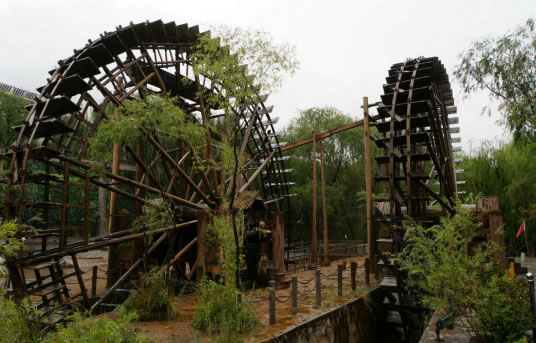 在水車廣場展現(xiàn)著各具特色的水車:在我們左側的是一架推水車(又稱水掛子),它依靠人力推動水車,將水提起,傾人水渠,灌溉農田;在我們右側的是一架腳踏水車,其原理是用力踩動木輪,由傳動鏈條帶動水車,達到提水灌溉的目的;