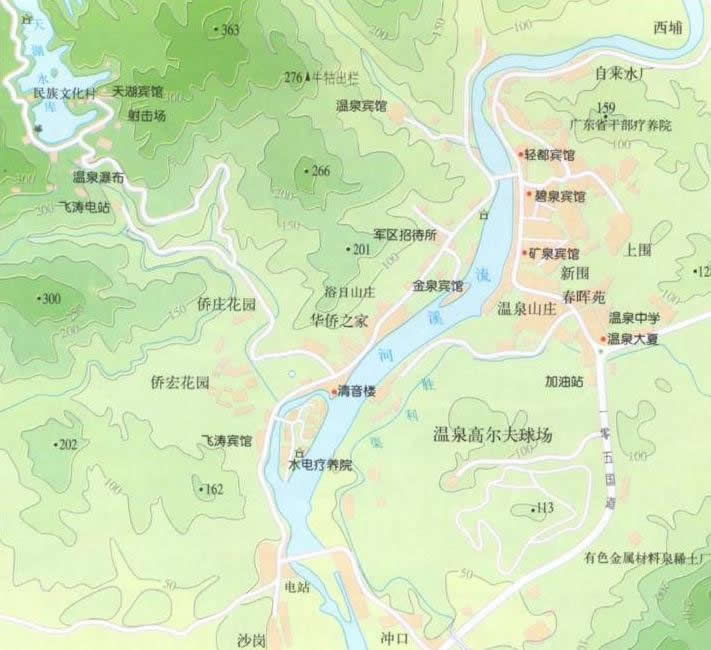 泉區(qū)共有泉眼13處,分布在河東、河西兩岸。泉水含有多種化學成份,溫度最高可達73℃,最低的也有30℃。在此洗浴,可以有效地消除身體的疲乏,調節(jié)各器官的功能,多次沐浴能達到祛病強身的目的。壯麗的碧浪橋橫跨流溪河,將兩岸連為一體。河東岸是溫泉療養(yǎng)區(qū),河西岸是旅游賓館別墅區(qū)。