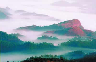 丹霞山主峰海拔409米,它與眾多名山相比遠不算高,也不算大,但它集黃山之奇、華山之險、桂林之秀一身,具有一險、二奇、三美的特點。風景區(qū)劃分為上、中、下三層以及錦江風景區(qū)、翔龍湖和有被譽為天下第一奇景的陽元山,上層是三峰聳峙;中層以別傳寺為主體;下層以錦石巖為中心。三百多年前澹歸和尚在丹霞山開辟別傳寺時,曾挑出12處風景,命名丹霞十二景:錦水灘聲、玉臺爽氣、杰閣晨鐘、丹梯鐵索、舵石朝曦、竹坡煙雨、雙沼碧荷、乳泉春溜、累頂浮圖、虹橋擁翠、片鱗秋月。