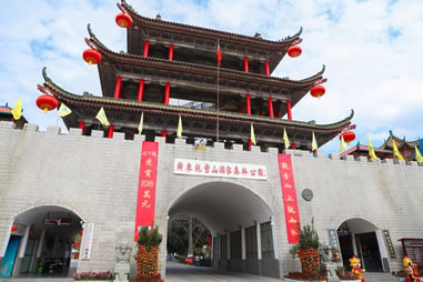 采用清代古城樓建筑風(fēng)格,飛檐翹角,氣勢(shì)恢宏,體現(xiàn)了中國(guó)古典建筑之美。內(nèi)設(shè)游客服務(wù)中心和售票處,是游客進(jìn)入觀音山景區(qū)所看到的第一道靚麗風(fēng)景。