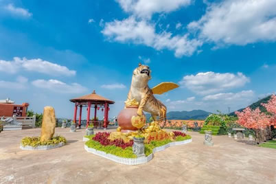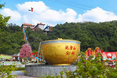 觀音山金碗滿溢金漆,光彩奪目,碗中有象征著“金銀”寶山,熠熠生輝,更有源源不斷流水滿碗而出,寓意著水滿財(cái)滿,財(cái)源不斷,捧個(gè)“金飯碗”,賺得盆滿缽滿。