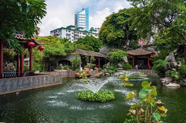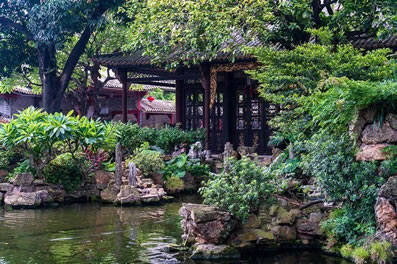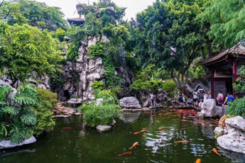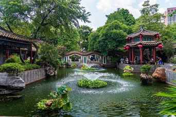 在花木配置方面,園內(nèi)花卉果木逾百種,除了嶺南園林常用的果樹,還栽種了蘇杭園林特有的紫竹、枸骨、紫藤、五針?biāo)、金錢松、七瓜楓、羽毛楓等,并從山東等地搜集了龍順棗、龍瓜槐等北京樹種,其中銀杏、沙柳、紫藤、龍眼、水松等古木樹齡已百年有余。