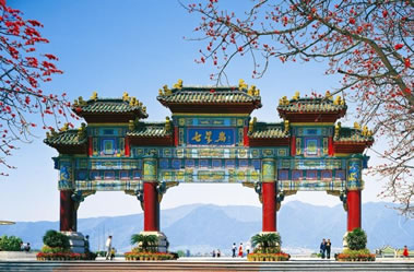 肇慶七星巖牌坊,在肇慶星湖最南面,即現(xiàn)牌坊廣場正前方,下有寬闊的大理石平臺和臺階式步級,前面與端州路交界,正對繁華的天寧北路,后面是寬闊的廣場與浩瀚似海的星湖。1959年落成,鋼筋混凝土仿古建筑,高12米,寬17.5米,四柱三間,柱礎(chǔ)花籃形,四根大圓柱飾以朱紅,仿歇山頂,上蓋琉璃瓦,中門上方鑲嵌著朱德于1959年手書的“七星巖”三個(gè)大字,為肇慶的重要標(biāo)志物。