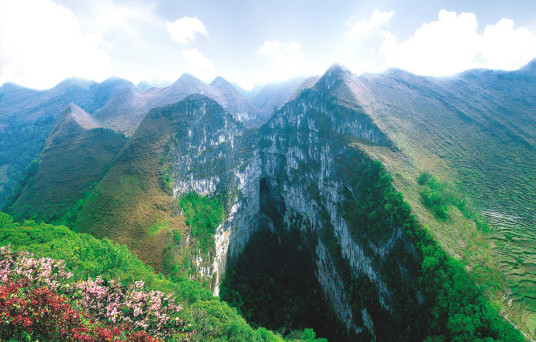 樂(lè)業(yè)天坑群:天坑群由方圓十多平方公里范圍的數(shù)個(gè)巨大的天坑狀溶洞組成。最大的天坑“大石圍”直徑500多米,深400多米,坑底有神奇的地下森林和地下河。其他的天坑,坑與坑之間有溶洞相連,非常罕見,所以被譽(yù)為“中華一絕”。