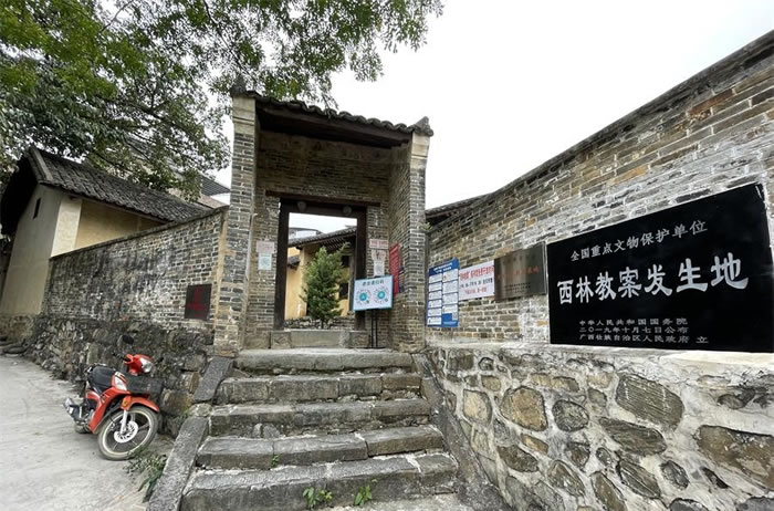 位于現(xiàn)田林縣定安鎮(zhèn),1852年起,法國(guó)侵略者派天主教神甫馬賴潛到田林縣定安鎮(zhèn)一帶,以傳教為名進(jìn)行非法活動(dòng)。馬賴等人目無官府,肆意橫行。1856年2月,西林縣知事張鳴風(fēng)順應(yīng)民心,依法將馬賴及其忠實(shí)信徒白小滿、曹貴(女)等三人在定安教場(chǎng)斬首示眾,這就是當(dāng)時(shí)震驚中外的“西林教案”事件,也稱馬神甫事件。法國(guó)拿破侖三世以此為借口,與英國(guó)侵略者串通一氣,向中國(guó)發(fā)動(dòng)第二次鴉片戰(zhàn)爭(zhēng),并強(qiáng)迫清政府在西林縣城定安鎮(zhèn)建起規(guī)模較大的天主教堂,定安鎮(zhèn)從此成為法國(guó)傳教士宣傳洋教的一個(gè)據(jù)點(diǎn)。 鑒于“西林教案”曾經(jīng)是近代中國(guó)人民反洋教斗爭(zhēng)高潮的前奏的特殊歷史意義,1994年自治區(qū)政府將其列為文物保護(hù)單位。