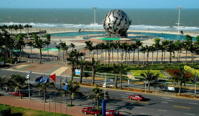 海灘公園,是銀灘國家旅游假區(qū)的重要組成部分,位于北海市中心以南十公里的北海銀灘中部。公園由三部份組成,東區(qū)設有琴、棋、書、畫院.中間是海灘、海上活動區(qū);西區(qū)是海洋生物館、兒童戲水池、大型露天舞池等組成的游樂區(qū),可同時容納游客6萬多人。 [21]鋼塑“潮”位于銀灘旅游度假區(qū)的海灘公園內,它是由地道的北海人、中央美術學院副教授魏小明設計,由中房北海公司投資一千多萬元,用兩個月零15天建成。整座雕塑以象征一顆大明珠的球體和七位裸體少女護衛(wèi)球為主體,并由安裝有5200個噴頭的音樂噴泉組成。雕塑高23米,鋼球直徑20米。巨大的鋼球是用不銹鋼鏤空制成。整座建筑以大海、珍珠、潮水為背影。