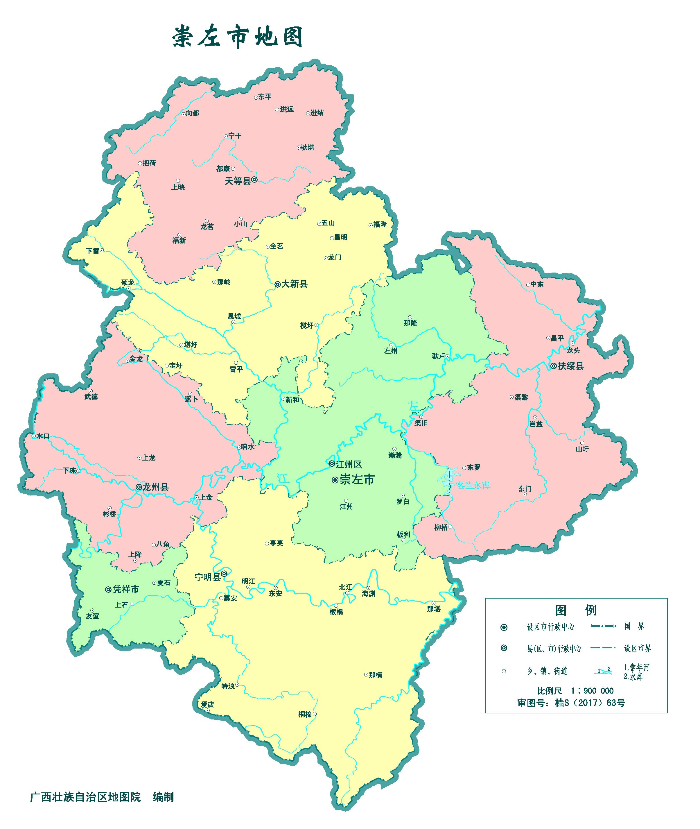 崇左市轄1個市轄區(qū)、5個縣,代管1個縣級市: