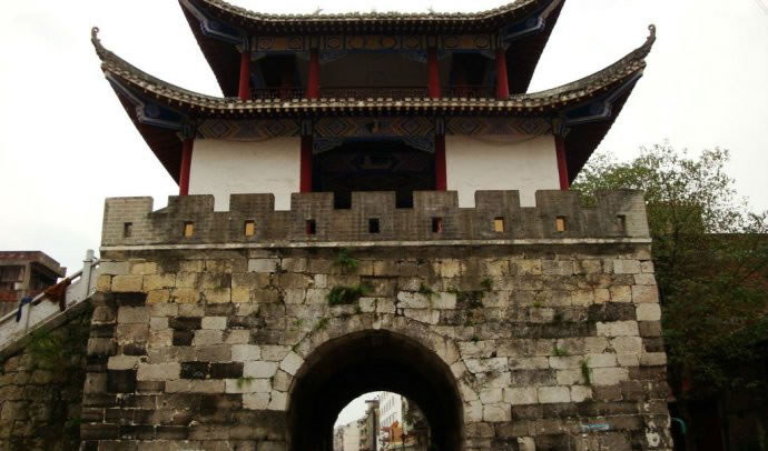 四牌樓,位于宜州區(qū)一中東側(cè),建于乾隆二十五年,時稱“會魁樓”,又稱“四牌樓”。此樓位于十字路口,形成東西南北四個門洞,內(nèi)外相通。四牌樓樓高三層,一樓全用大型細鑿條石砌成,呈四方形,工藝精巧。邊長11.5米,四面拱門各高3.9米,寬3.5米。二三樓為木質(zhì)結構的重檐樓閣,紅漆圓柱,飛彩流丹,古樸莊重。“文革”中二三樓被拆毀,只存有一樓拱洞石門,樓上建筑及額匾碑刻已不復存在。