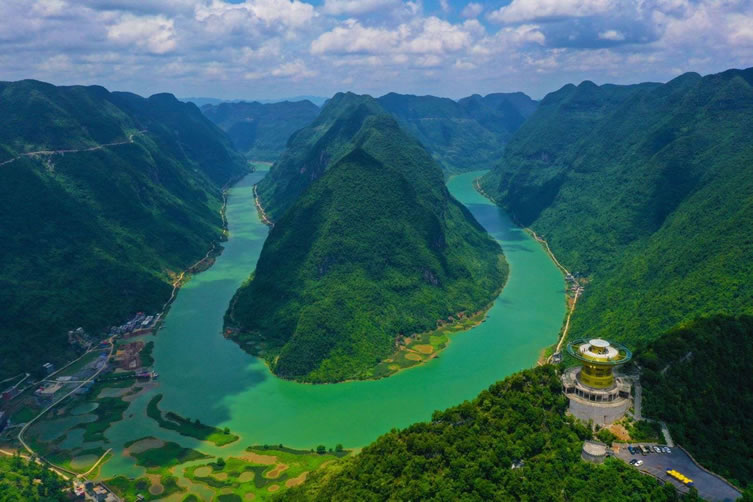 “紅水河第一灣”是國家AAAA級景區(qū),位于三石鎮(zhèn)板文村。紅水河在流經(jīng)東蘭縣板文村境內(nèi)拐了一個大彎,形成一個“U”字型的大峽谷,山環(huán)水繞,碧如玉環(huán),中間主峰如神龜靜臥,兩岸峰叢對稱排開,谷底河灘幾十個水譚或?qū)ΨQ、或連通,奇妙非常。山間林木翠綠蔥蘢,獼猴跳躍,百鳥爭鳴。在山頂上銅鼓觀景玻璃臺觀賞第一灣奇景,若在晨起碰到云霧天氣,霞光普照,霧繞神灣,幻若仙境。有詩描述:“一灣驚天下,回首造高峽,千山還壯美,奔流再出發(fā)!”該景區(qū)是紅水河的精華河段,是攝影、探險、休閑度假的好地方。