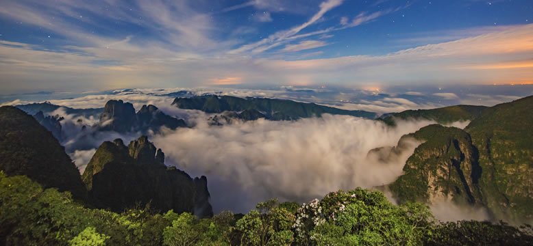 圣堂山景區(qū)位于金秀縣城南面,距金秀縣城38公里,距柳州市區(qū)134公里,距桂林市區(qū)210公里,距南寧市區(qū)329公里,距來賓市區(qū)224公里,景區(qū)面積約120平方公里,山體結(jié)構(gòu)架由7座海拔1600米以上巍峨奇異的群峰組成,主峰海拔1979米,為桂中第一高峰、廣西第五高峰。圣堂山山體龐大、崎嶇陡峭、怪石嶙峋,山上神奇秀麗的萬畝變色杜鵑林,變幻莫測的云海迷霧,奇松怪樹,古樸原始,自然生態(tài)優(yōu)良,物種豐富,森林覆蓋率達(dá)95.6%,具有雄、奇、險(xiǎn)、秀、古、野等獨(dú)特景觀特色。