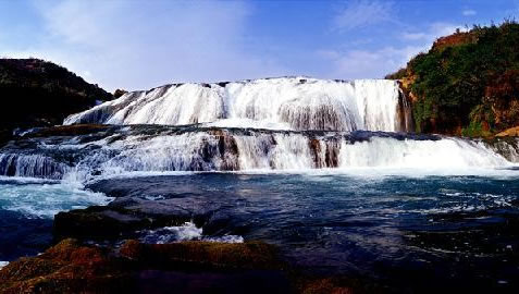 平水時(shí),白水河流量不大,水流清澈,瀑布水層沿著和緩的瀑面,均勻地撒開(kāi),如一層薄薄的、半透明的面紗,又如一面面張開(kāi)的素絹扇面,在陽(yáng)光下泛著銀光,故有人戲稱(chēng)為“新娘面紗”。但當(dāng)洪季來(lái)臨,白水河中由于攜帶了大量山洪沖下來(lái)的泥沙而呈土黃色,陡坡塘瀑布便消失了往日平水時(shí)的秀色,而變得異常兇猛雄壯。