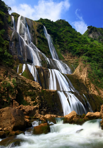 滴水灘瀑布位于黃果樹(shù)瀑布以西8公里,總高度和個(gè)體都為黃果樹(shù)瀑布群之首。這里兩山對(duì)峙,東為大坡頂,西為關(guān)索嶺,中間是深達(dá)700米的霸陵河峽谷,瀑布就掛在關(guān)索嶺大山上。滴水灘瀑布總高410米,為黃果樹(shù)瀑布的五倍,最下層134米,雄偉磅礴。