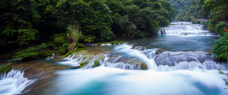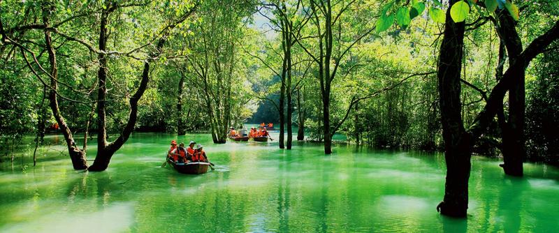 水上森林,長約600米,分上下兩段。河谷里叢生著茂密的喬木和灌木,形成一道翡翠屏障。清澈的河水從河床的雜木林中穿涌而下。年復一年,日復一日的沖涮,河床已沒有了一粒泥沙,連磐石也被激流磨光了棱角而變得“圓滑”,樹木卻扎根在河床里,紋絲不動,四季常青。是“水在石上淌,樹在水中長”的奇景。