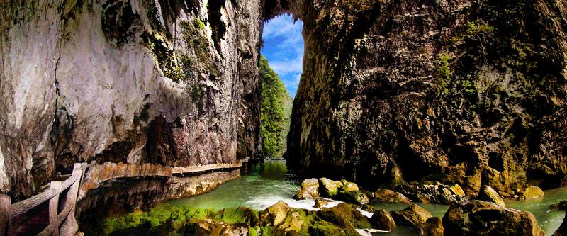 天鐘洞長二千公尺,洞廳高大,廓道迂回。鈣化堆積物發(fā)育良好,形態(tài)逼真生動,且洞內(nèi)道路平坦,可觀性強。洞內(nèi)鐘乳石多酷肖動物,有鱷魚廳,金雞廳、百獸廳和犀牛廳等。