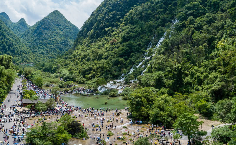 瀑布風前千尺影,疑瀉銀河一派。翠谷瀑布群峰蒼翠,以植被郁郁蔥蔥而得名,懸于群山之腰,似玉帶垂于山間。瀑高60米,落下時水花飛濺形成一道道珠簾,云霧繚繞,隨山勢而下的瀑水猶如白龍歸家,一瀉千里。