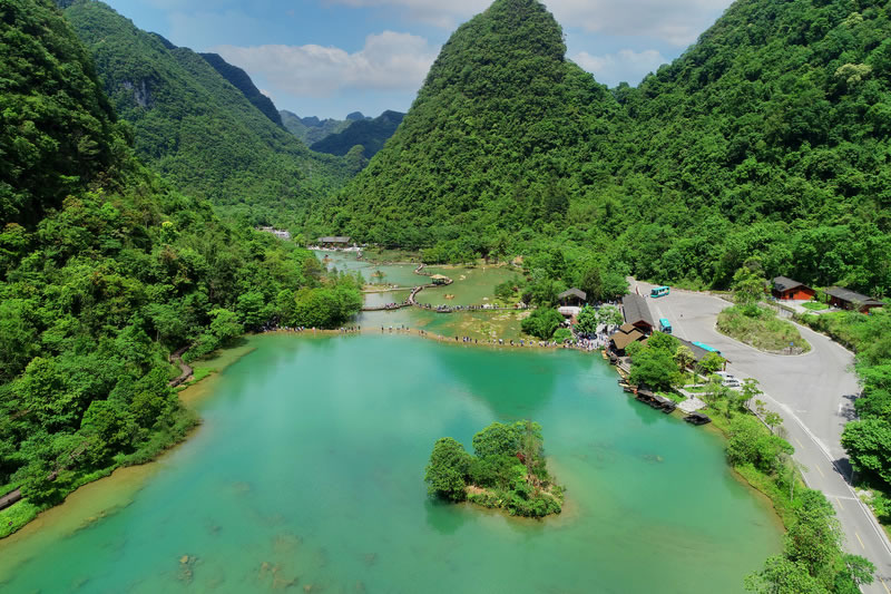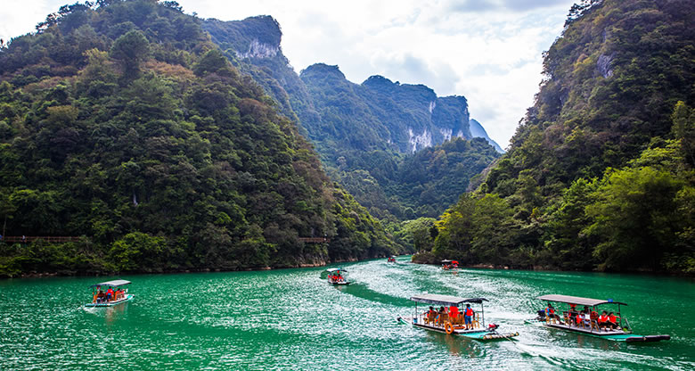 乘橡皮舟順水緩緩而下,兩岸是蔥茸秀麗的喀斯特原始植被,幽靜的河水中,時而有魚兒躍起,時而有秀美島嶼出現(xiàn),宛如精巧的天然盆景。山水含情天做媒,帶著情侶竊竊私語,帶著老伴同舟共濟,帶著朋友戲水歡歌。