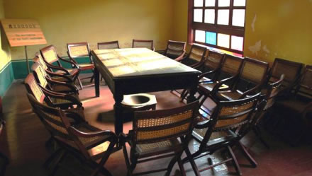 遵義會議會址是在二樓東側(cè)的長方形,客廳面積27平方米,墻上掛著一臺時(shí)鐘,客廳中央有一褚色長方桌,周圍有一圈木架藤條折疊靠背椅。西墻是一排玻璃窗,可見遠(yuǎn)處青山和臨街民房。