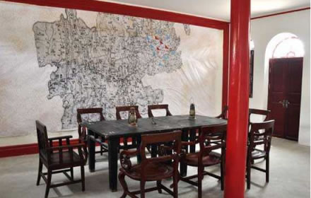軍委總司令辦公室(作戰(zhàn)室)在遵義會議會議室正對的樓下,面積為56平方米,兩間長方形的房間組成,中間布一道可折疊的六合門。屋子正中陳列著兩張黑漆大方桌,桌上有鐵座馬煙、訂書機(jī)、中華蘇維埃共和國革命軍事委員會信 、報(bào)紙做的信封、30年代商務(wù)印書館出版的中國分省地圖冊以及《陳中日記》等。屋子的西窗下陳列著兩張三屈桌,桌上置西部皮包電話機(jī),桌下立著線拐子。東窗下陳列著一對灰褐色的鐵皮公文挑箱。北壁上陳列著一幅巨大的云、貴、川三省接壤地區(qū)的軍用地圖,當(dāng)年軍委副主席周恩來、紅軍總司令朱德、總參謀長劉伯承等經(jīng)常在這里辦公。