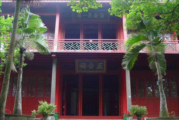 五公祠位于國興街道海府路169號,是為紀念唐宋時期貶謫到海南的五位著名歷史人物:唐朝名相李德裕、宋朝名相李綱、李光、趙鼎、名臣胡詮而建的,故名五公祠,現(xiàn)為全國重點文物保護單位。 五公祠為一組古建筑群的統(tǒng)稱,它由海南第一樓、觀稼堂、學圃堂、東齋組成,并和蘇公祠、兩伏波祠及其拜亭、洞酌亭、粟泉亭、洗心軒、游仙洞等連成一片,建筑面積2800余平方米,連同園林、井泉、池塘約占地100畝。始建于明萬歷年間,清光緒十五年(1889年)重修,后又多次修繕,現(xiàn)仍是熠熠生輝。