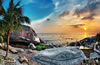 天涯海角位于天涯區(qū)的馬嶺山腳下,距三亞市區(qū)約26千米。其前海后山,風景獨特。步入游覽區(qū),沙灘上那一對拔地而起的高10多米,長60多米的青灰色巨石赫然入目。兩石分別刻有“天涯”和“海角”字樣,意為天之邊緣,海之盡頭!疤煅暮=恰本褪怯纱说妹。