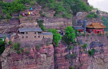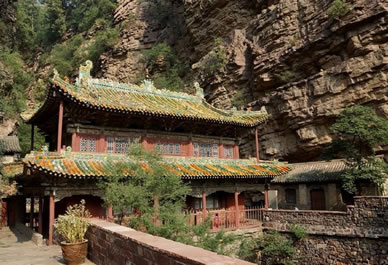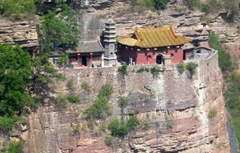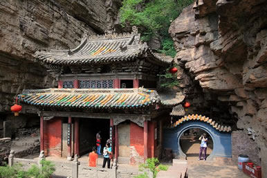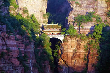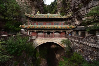 一絕“橋樓殿”。橋凌駕于百仞峭壁之間,仰視藍天一線,俯首萬丈深淵。形制如同趙州橋敞肩拱式。橋上建樓,云飛樓動,樓內(nèi)建殿,殿內(nèi)三尊大佛。真是“千丈虹橋望入微,天光云彩共樓飛”,不是仙境勝似仙境,疑是天堂落塵埃,F(xiàn)為中國三大懸空寺之一。