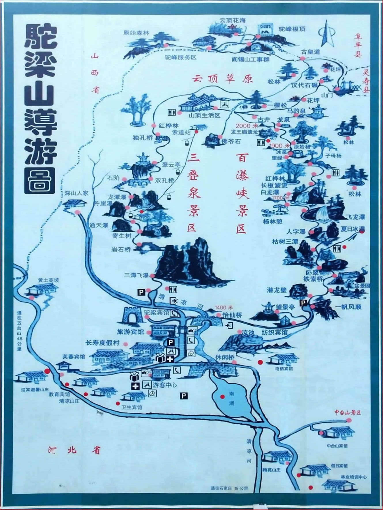 駝梁自然風景區(qū)位于河北省平山縣西北部,東距省會石家莊市150公里,西距佛教圣地五臺山45公里,北起駝頂,南至四道溝(又稱南溝),長5公里;東自峰脊,西至山西省界,寬約4公里,總面積為22平方公里,主峰海拔2281米,是平山、阜平、山西五臺三縣的分水嶺,為河北省五大高峰之一,在當?shù)乇环Q為“小泰山”,素有“省會屋脊”之稱。駝梁之名,是因山頂兩峰此起彼伏,形如駱駝峰脊而得。山體屬典型的變質巖地貌結構。以奇、秀、高、遠聳立于巍巍太行,更以涼、幽、靜、野而馳名華北,久享“太行綠寶石”美譽。由四道溝入山,沿碎石路蜿蜒而上,兩側青山聳立,怪石磷峋,松生崖,虬藤攀緩,路邊流水撫石,樹間小鳥鳴唱,好一派風光。