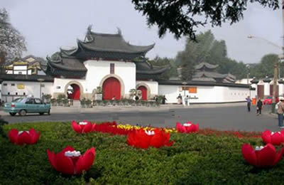 歸元寺的外山門為新山門,采用仿古風(fēng)格設(shè)計(jì)而成。外山門的扇門為仿古式朱紅殿門,為三開(kāi)門式,中間為一大拱門,左右各有一小拱門。