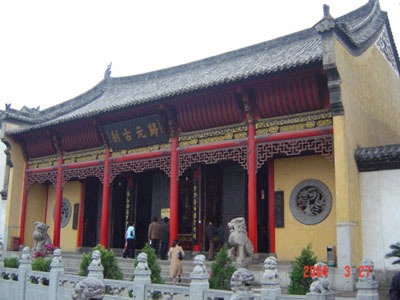 中院的主體建筑是大雄寶殿。該殿初建于清順治十八年(1661年),后經(jīng)多次維修,F(xiàn)大雄寶殿是清光緒三十四年(1908年)重修,經(jīng)過(guò)近年來(lái)的維修,氣勢(shì)宏偉。大殿正中供奉著釋迦牟尼坐像,兩側(cè)為其弟子阿難和迦葉,均為托沙雕塑。釋迦“偏袒右肩,結(jié)跏趺坐”,十分莊嚴(yán)靜穆,威儀儼然。佛像后的背光是用樟木雕刻而成的“五龍捧圣”的圖案。佛像前還有韋馱、彌勒、地藏像,佛像后是一組海島觀音像,只見(jiàn)海島觀音赤足站在鰲頭上,左右侍立著龍女和童子,背后是一面高達(dá)八尺的泥塑懸崖峭壁,足下碧波萬(wàn)頃,怒濤洶涌。整個(gè)塑像向前傾覆。人們仰視上去,只見(jiàn)觀音衣袖似在飄動(dòng),正在洶涌的波濤上迎面向你浮來(lái),增加了宗教藝術(shù)的感染力。