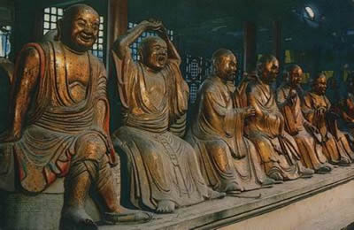 走進(jìn)羅漢堂,無(wú)不被它們的生動(dòng)形象所感染。只見(jiàn)有的盤腿端坐,有的臥石看天,有的研讀佛經(jīng),有的驅(qū)邪除惡。表情上,有的勇武,有的溫良,有的天真憨厚,有的飽經(jīng)滄桑,個(gè)個(gè)維妙維肖,活靈活現(xiàn)。如第463尊羅漢是颯陀怒尊者,四周有6個(gè)童子,為羅漢挖耳、掩嘴、遮眼等,稱“六賊戲彌勒”。六賊即眼、耳、鼻、舌、身、意。它告誡佛門弟子,不要為凡情所染。塑像中把孩子的天真爛漫,嬌稚頑皮和羅漢的慈祥憨厚的神態(tài)刻化得淋漓盡致,讓人們從心底發(fā)出贊嘆的笑聲。