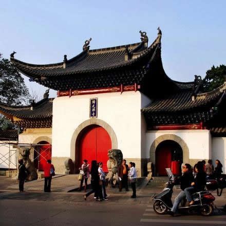 山門為古典式的八字門形式建筑,朝陽(yáng)而開(kāi),象征吉祥。歸元禪寺山門前的石獅,連座共高2.3米,原鎮(zhèn)守在漢陽(yáng)縣衙、府衙門前,是明代遺物。武漢解放之后,漢陽(yáng)顯正街的衙門撤銷,信眾將被棄下的石獅合力搬到了歸元禪寺。
